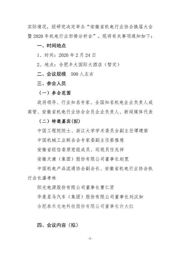 關(guān)于參加安徽省機(jī)電行業(yè)協(xié)會(huì)換屆大會(huì)暨2020年機(jī)電行業(yè)形勢(shì)分析會(huì)的通知
