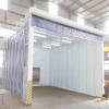 整個伸縮房由以下幾部分構成:門框架、帆布支撐網(wǎng)、剪式伸縮機構、阻燃PVC帆布、驅動機構等部分組成。門框架采用工業(yè)型材制成,是驅動電機直接帶動的部分,整個伸縮機構穩(wěn)定運動的關鍵所在。大門框架上設置有開關按鈕并行程開關,用以自動控制大門的伸縮。除去門框,其余部位就是帆布支撐網(wǎng),是阻燃帆布安裝連接的骨架,由多組型材骨架構成,并通過剪式伸縮機構將整個相對獨立的骨架連接在一起,形成一個穩(wěn)定的整體。在每兩個帆布支撐網(wǎng)之間,采用剪式伸縮機構相連,其結構尺寸決定了伸縮量,同時為了保證上下都能同時實現(xiàn)伸縮動作,在每側上下各布置一套剪式伸縮機構,兩者之間通過連桿形成一個同步運動機構。在整個網(wǎng)架之間采用工業(yè)阻燃PVC帆布,這是形成相對封閉作業(yè)間的“墻板”,也是保證空氣有序流動的“房體”。安裝時每兩個支撐網(wǎng)采用一塊工業(yè)帆布。在噴漆室的大門上安驅動部分。驅動部分采用減速電機,傳動到多節(jié)長軸上,再由長軸兩端鏈輪同步傳動到兩側主動輪上。整個驅動前進、后退采用三級保護:雙向兩級行程保護軌道終端設置限位車擋;門柱上邊有控制盒,操作方便。